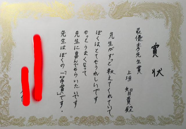 先生がずっと教えてくれていて僕はとてもうれしいです。もっとうまくなって先生に喜んでもらいたいです。先生は僕の『一等賞』です