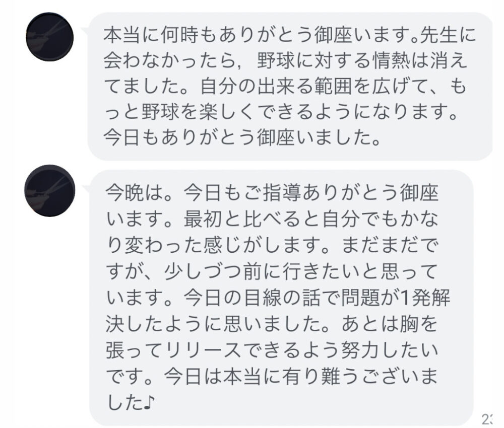 本当に何時もありがとう御座います。先生に会わなかったら、野球に対する情熱は消えてました。自分にできる範囲を広げて、もっと野球を楽しくできるようになります。
