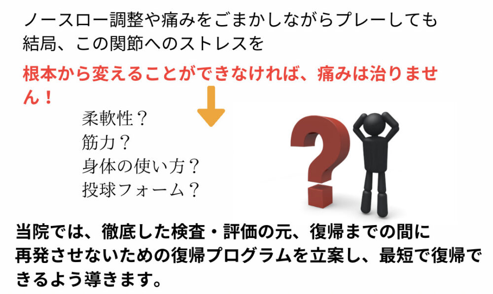 今後の改善過程や球数や距離の設定を行い、再発を防ぎます。