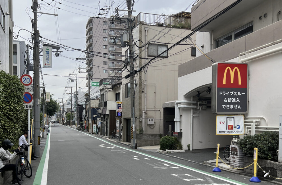 マクドナルドの方向に歩き、始めの曲がり角を左折します。